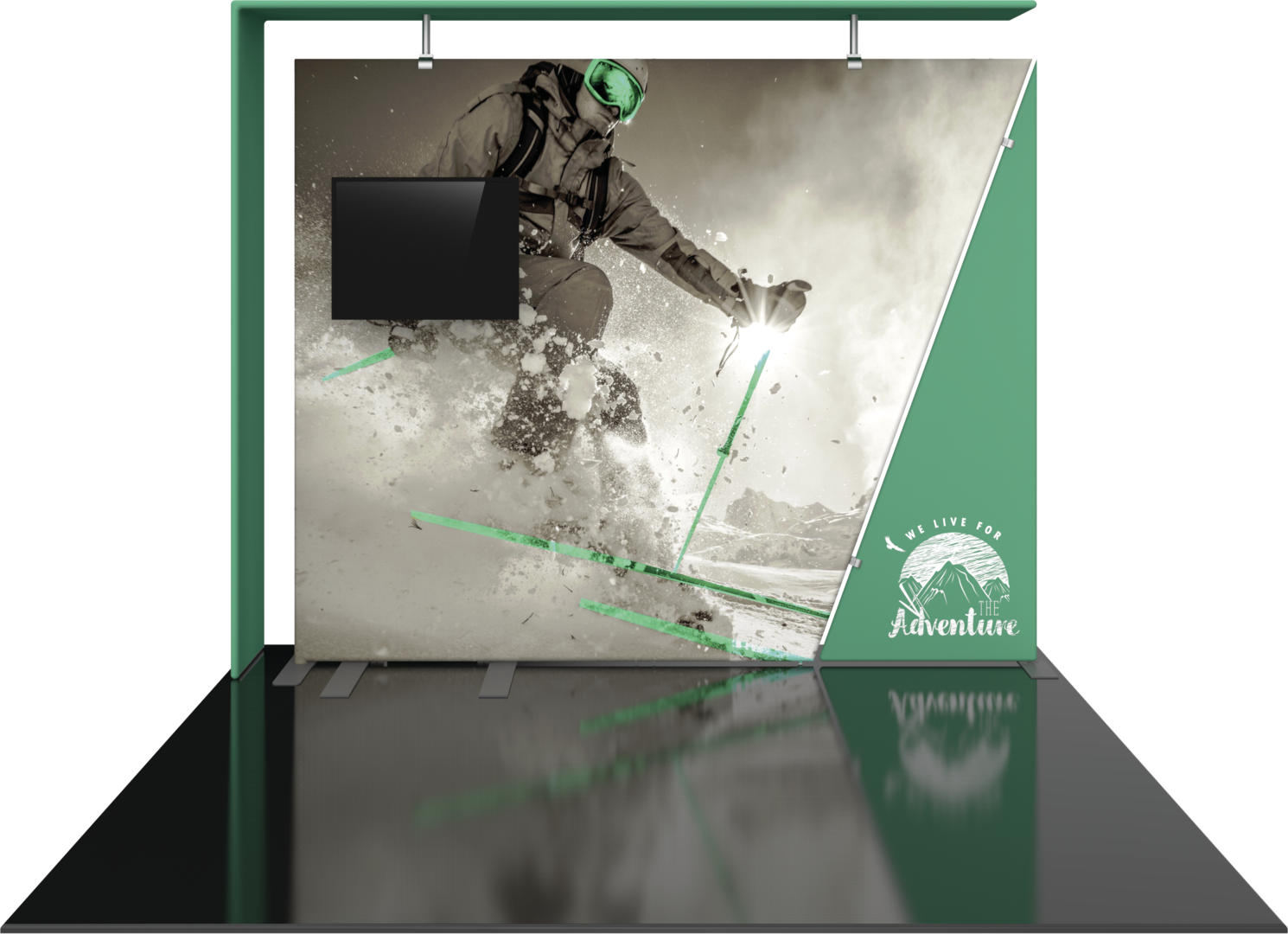 Formulate® Designer Series 10ft Fabric backwall Kit 08 is a sophisticated fabric exhibit that features two aluminum tube frames for the backwall featuring snap/button spigot connections, a kiosk supporting a medium monitor mount for multimedia display, a tubular/fabric canopy, and simple pullover zipper pillowcase fabric graphics. Designer Series Kit 08 comes in three portable, expandable wheeled transit cases for easy storage and transport. Assembly and graphic attachment is easy - simply pull the pillowcase fabric graphics over the frame and zip.