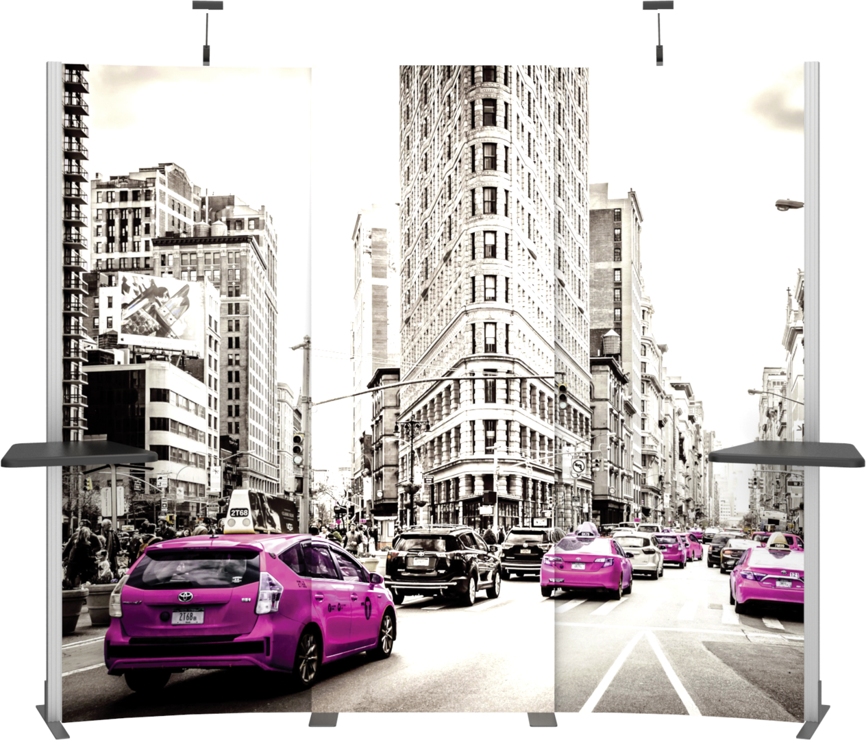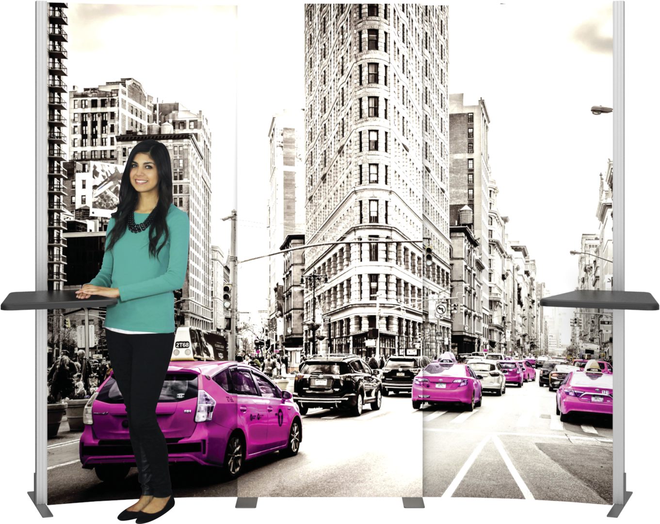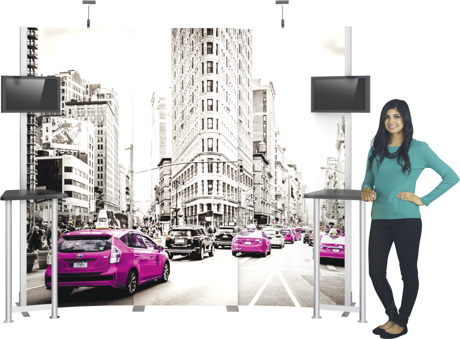 Hybrid Pro™ Modular Kit 01 is an ideal 10ft x 10ft inline display solution for the serious exhibitor. Kit 01 combines heavy-duty aluminum extrusion frames and push-fit SEG fabric graphics for a stylish and finished look. Hybrid Pro Modular Kit 01 features dual monitor mounts, backwall tables, and a backlit center graphic panel to make messaging pop! LED display lighting is included for additional illumination. Count on making an unforgettable impact with Hybrid Pro Modular 10ft x 10ft Kit 01.