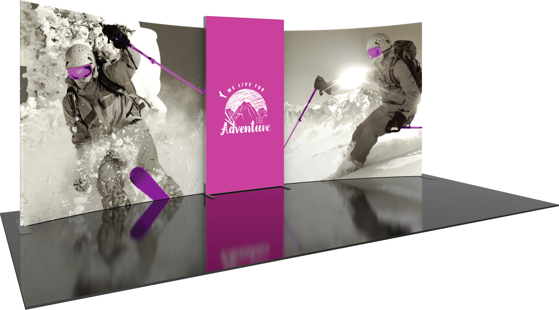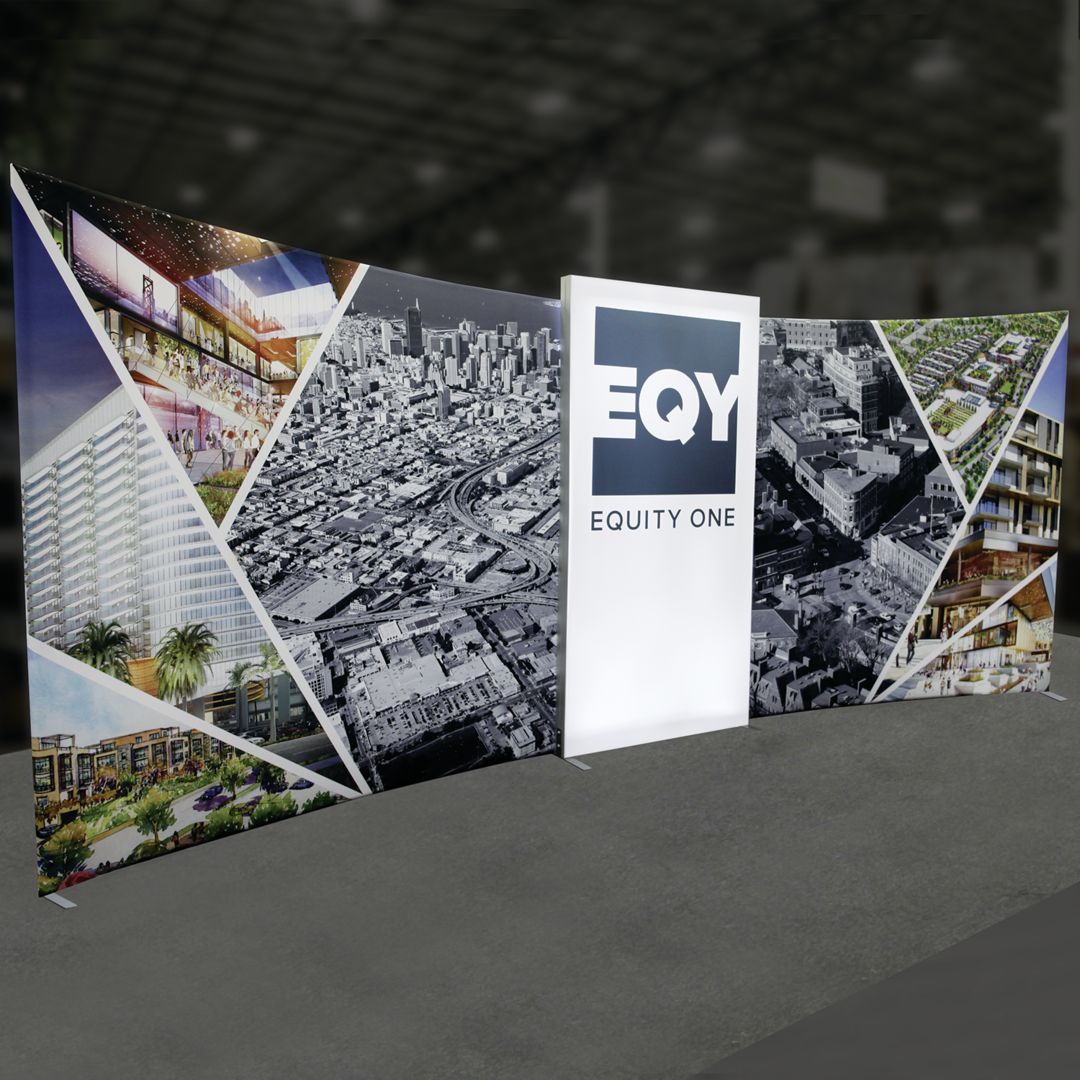 - Center wall features an extrusion frame, LED lights, and push-fit fabric graphics