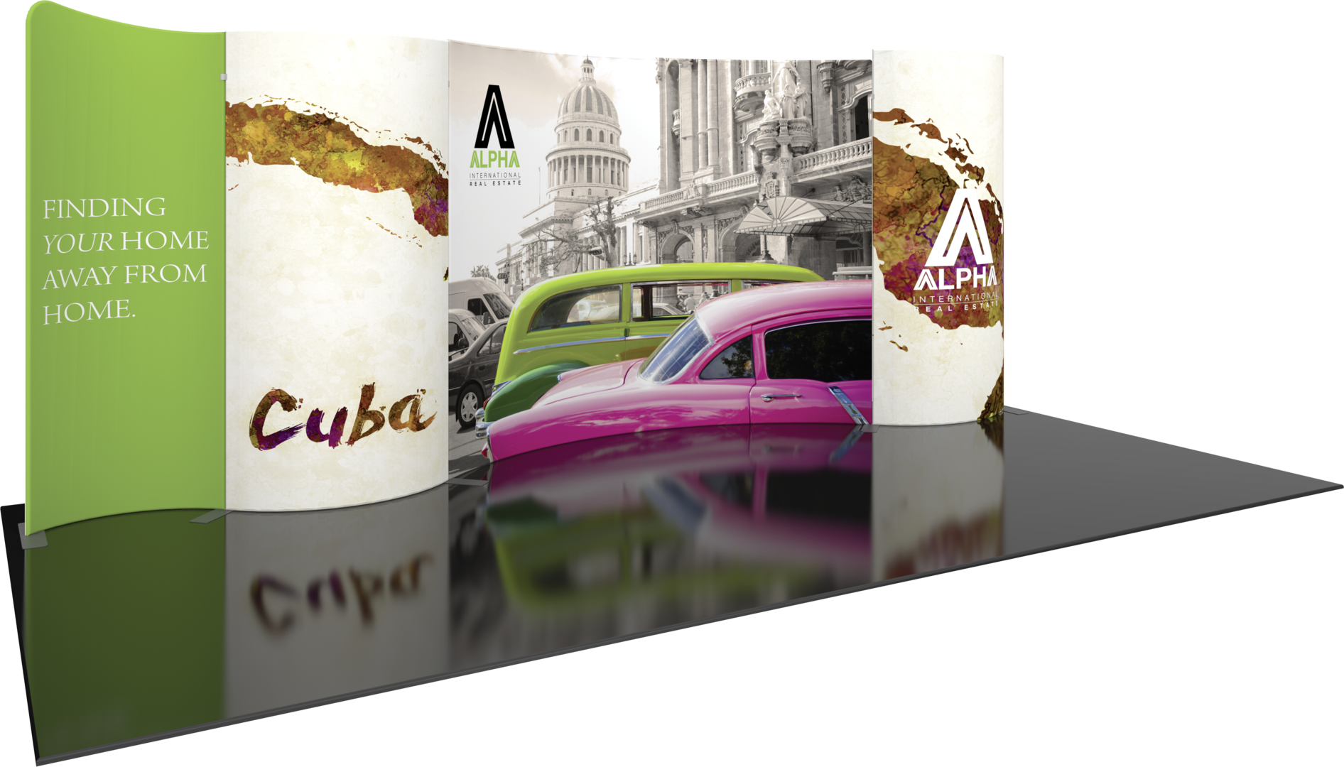 Modulate 20ft Kit 01 consists of four curved, magnetic fabric banners. Kit 01 can reconfigure into a 10ft display (MOD-FRM-05-M-TL) and can also be repurposed as individual banners. Versatile, simple, and smart displays help exhibitors maximize their display value.