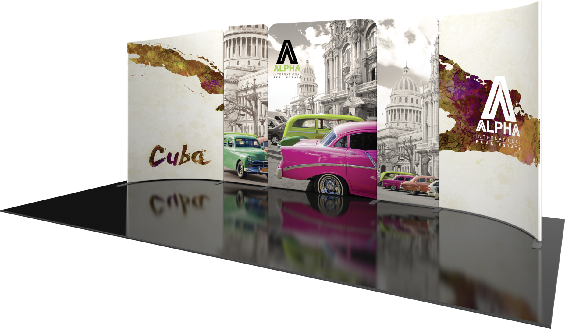 Modulate 20ft Kit 04 consists of three straight and two curved, magnetic banners. Kit 04 can reconfigure into a 10ft display (MOD-FRM-09-M-TL + MOD-FRM-10-M-TL) and can also be repurposed as individual banners. Versatile, simple, and smart displays help exhibitors maximize their exhibit value.