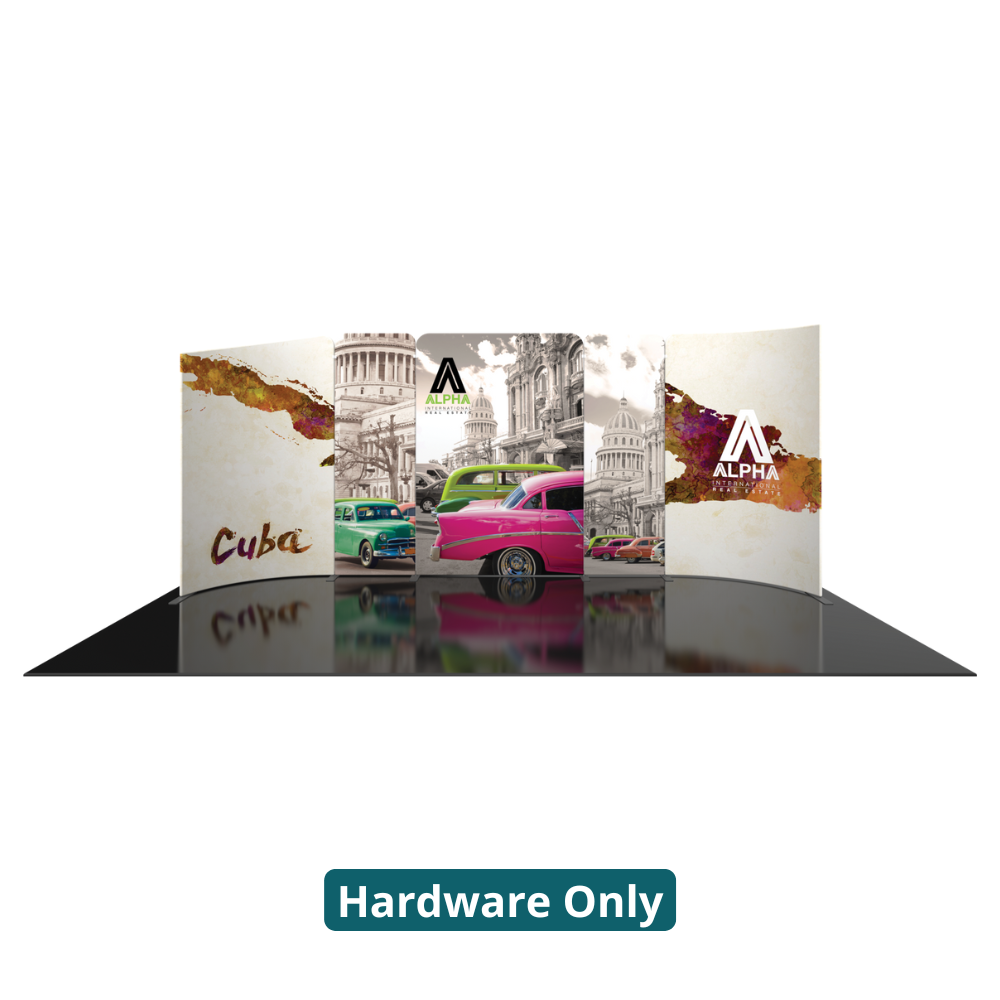 Modulate 20ft Kit 04 consists of three straight and two curved, magnetic banners. Kit 04 can reconfigure into a 10ft display (MOD-FRM-09-M-TL + MOD-FRM-10-M-TL) and can also be repurposed as individual banners. Versatile, simple, and smart displays help exhibitors maximize their exhibit value.