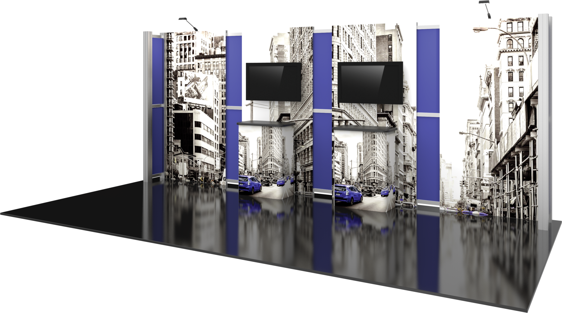 Hybrid Pro™ Modular Kit 13 is an eye-catching 10ft x 20ft inline display solution, perfect for the serious exhibitor, and featuring a heavy-duty aluminum extrusion frame coupled with seamless push-fit SEG fabric graphics and rigid graphic inserts. Kit 13 is accented by dual monitor mounts and backwall counters with storage space, ideal for adding messaging and functionality to any exhibit. LED display lighting adds illumination. Kit 13 is reconfigurable into 10ft x 10ft Kit 05, increasing the value, lifecycle, and functionality of the exhibit. Count on making an unforgettable impact with Hybrid Pro Modular 10ft x 20ft Kit 13.