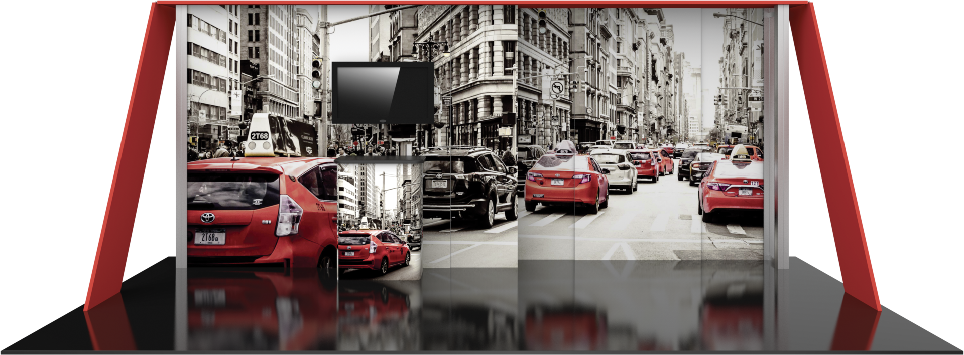 Hybrid Pro™ Modular Kit 15 provides a dynamic solution for your display needs. This 10ft x 20ft kit features durable aluminum frames and custom push-fit graphics, which combine with a central monitor mount and backwall storage counter for a functional, modern display. Side and top pillowcase fabric graphics add eye-catching accents to the display. Kit 15 is reconfigurable into 10ft x 10ft Kit 07, increasing the value, lifecycle, and functionality of the exhibit.