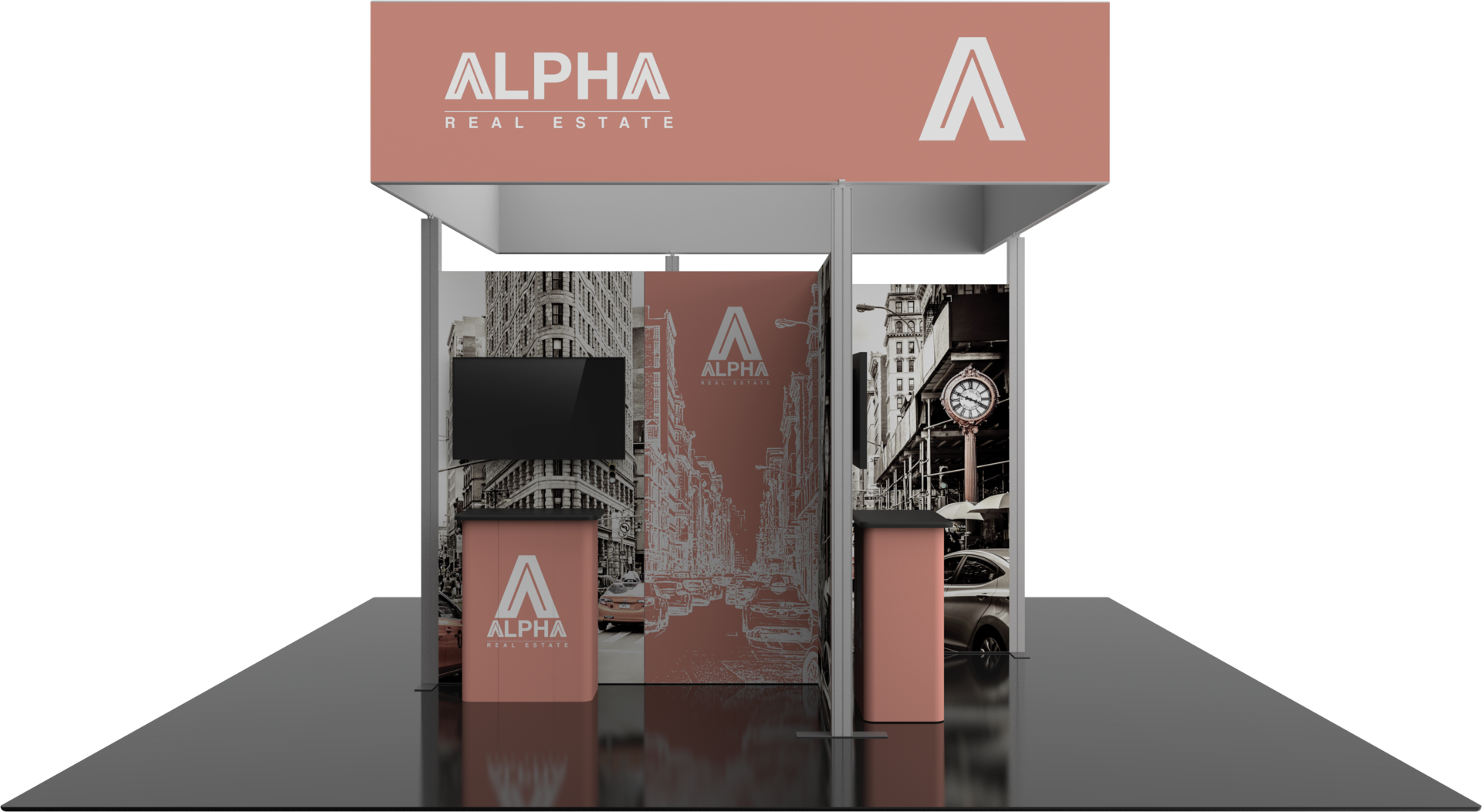 - Four sections / floor-based displays feature push-fit fabric graphics, medium monitor mounts and counters