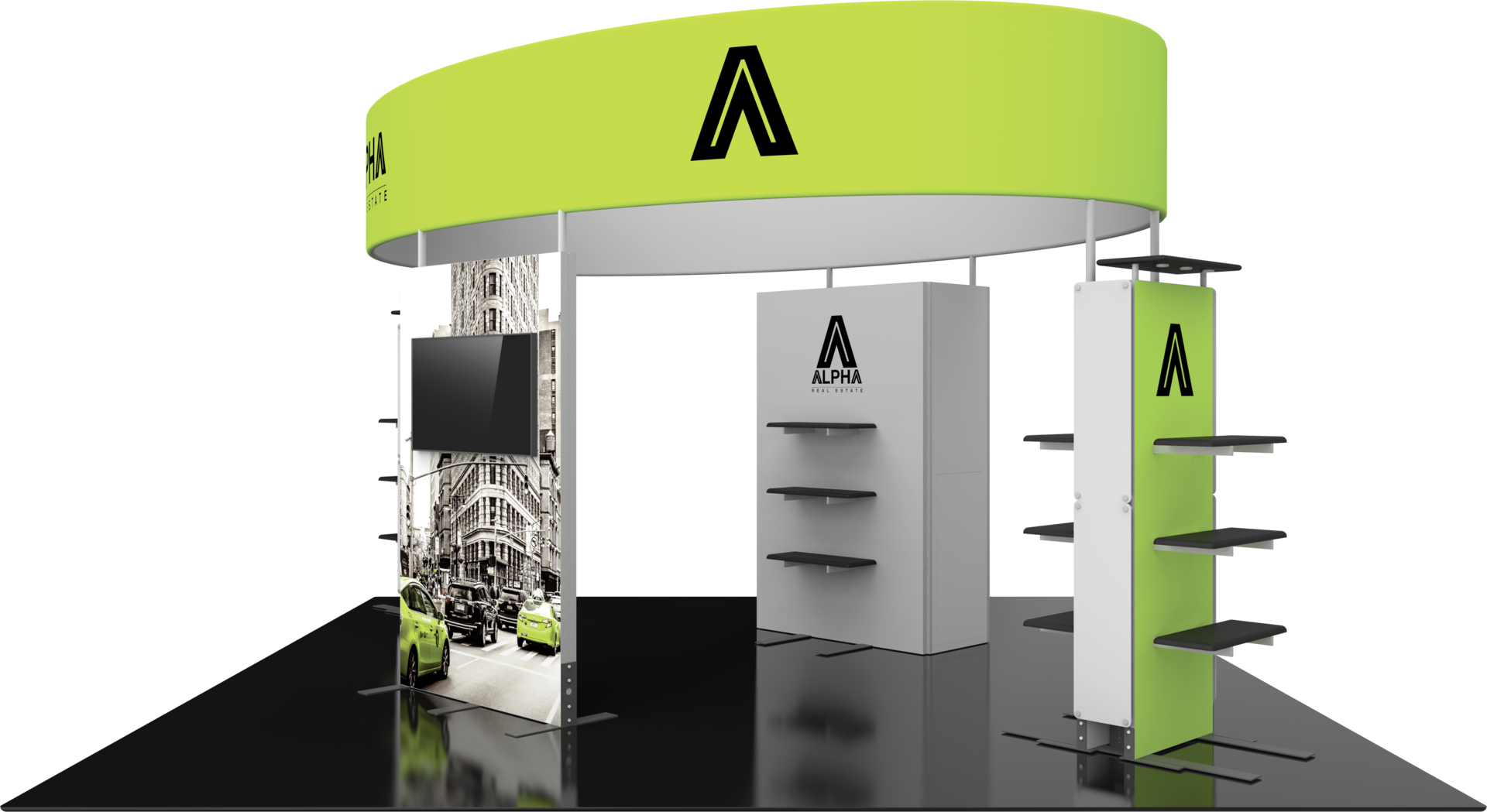 Hybrid Pro™ Modular Kit 32 is a modular 20ft x 20ft island exhibit that will captivate your audience and draw them in to meet with you. Hybrid Pro Kit 32 offers a combination of both multimedia and plenty of shelving for small products to be on display. Two displays anchor the exhibit on the sides - each includes six shelves, push-fit fabric graphics behind the shelves, frosted plexiglass on the sides, and a canopy that includes puck lights to illuminate the products on display. The two other anchored displays also offer functionality and features! Larger in footprint, one of the ground-based displays features a storage closet with easy access and a locking door; one side has a large/medium monitor mount and the other has three shelves for more product display. The last wall incorporates push-fit fabric graphics and a large/medium monitor mount for presentations. To top it all off, a large oval fabric structure provides excellent real estate for company branding and messaging.