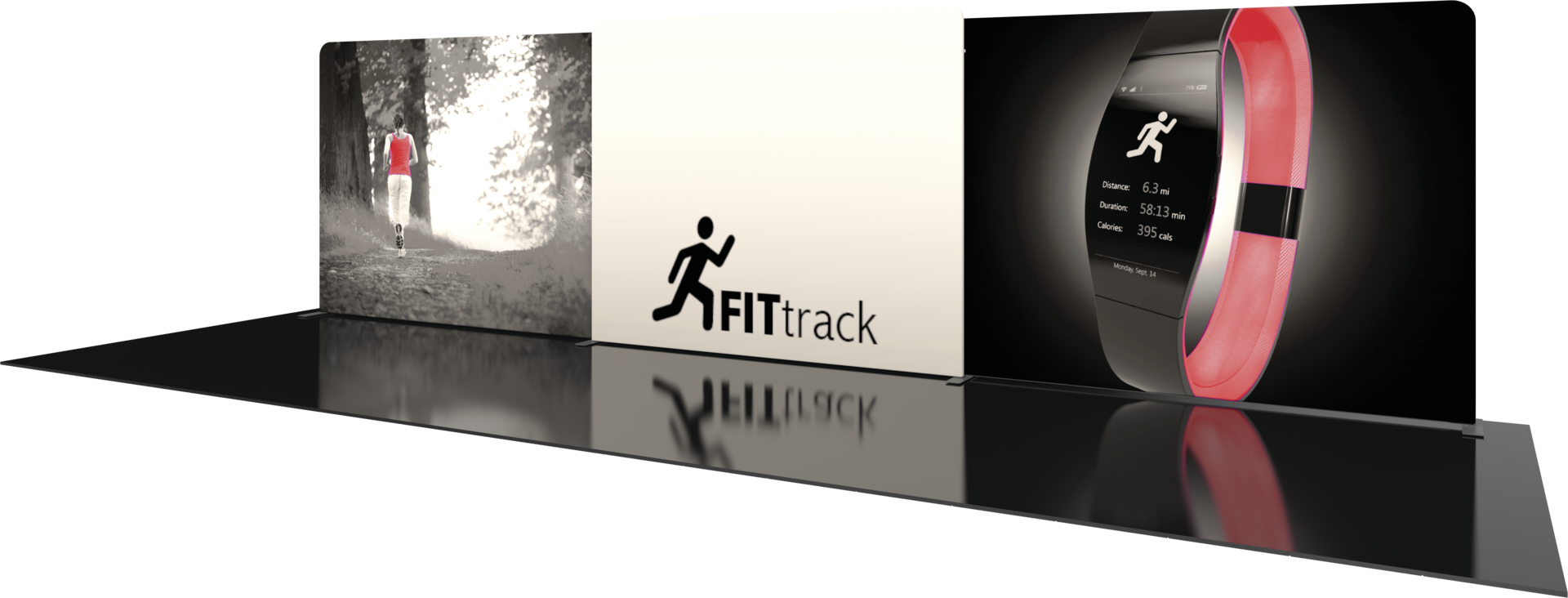 Formulate® Designer Series 30ft Backwall Kit 05 combines three straight backwalls to create a dominating, expansive inline display. The center wall is slightly taller than its neighboring walls, creating dimension and adding an element of style. The kit includes three aluminum tube frames with snap-buttons and three zipper pillowcase fabric graphics. Assembly is simple - connect the tubes, pull the graphics over the frames, and zip.