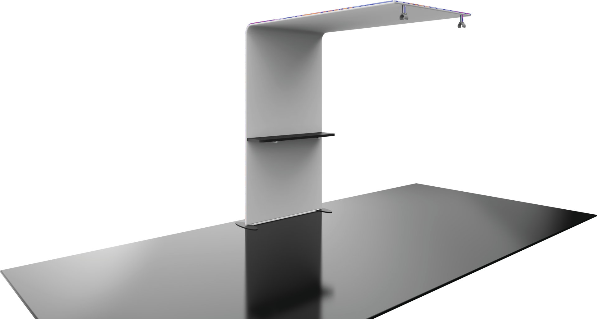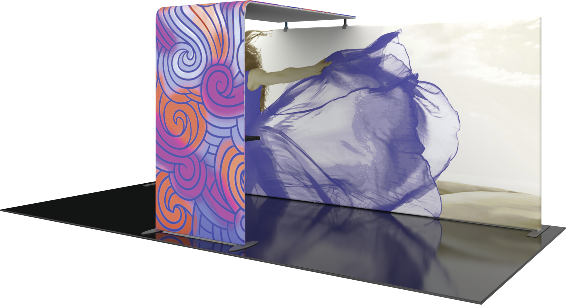 The Formulate® Master Backwall Accent 05 is an ideal dimensional accessory to connect to a Formulate Master 20ft or 30ft straight backwall that is being used in a Peninsula or Island exhibit space. It features a simply tube frame, pillowcase fabric graphic canopy, and table top and connects easily to create the appearance of one seamless display.