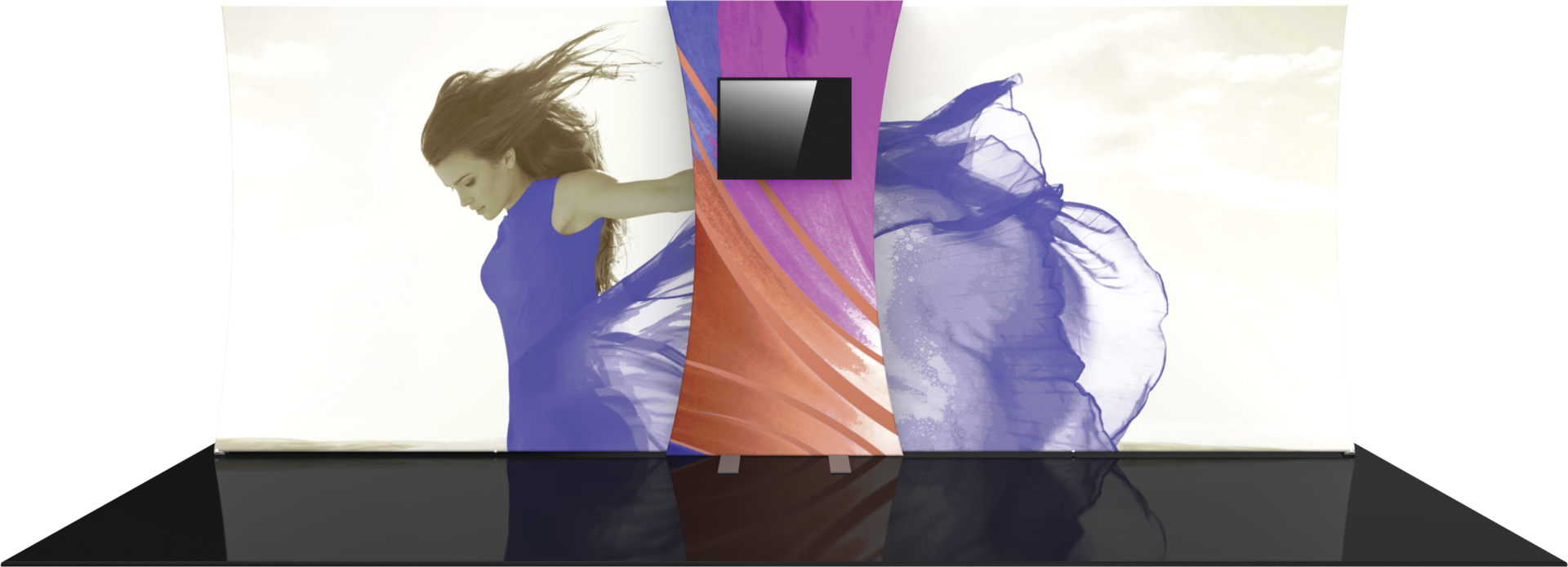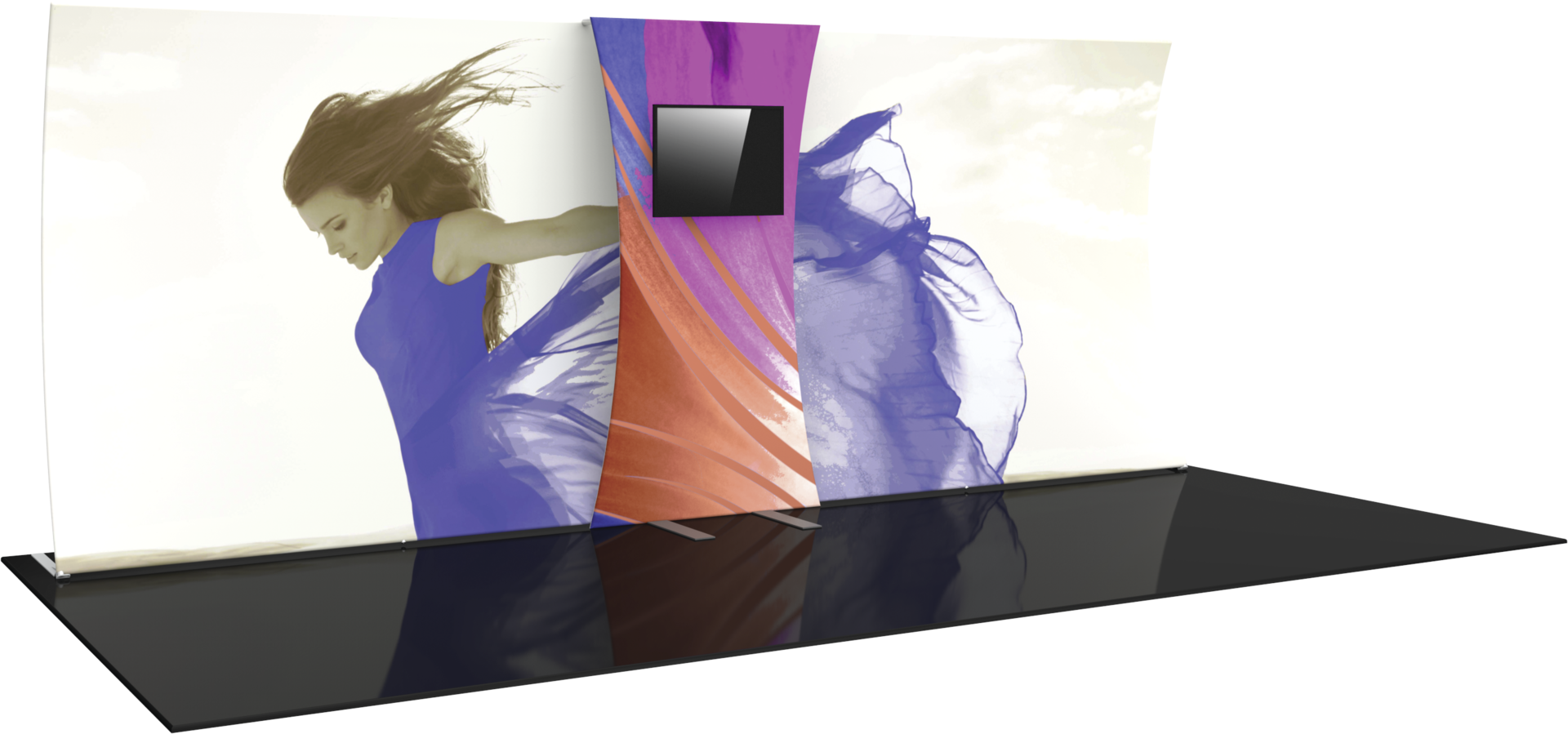 Formulate® Backwall Connector 05 is an ideal accessory to connect two 10ft or 20ft Formulate Master backwalls (excluding VC6) to create the appearance of one seamless display. The bowtie-shaped connector includes a tubular frame, a monitor kiosk supporting a medium monitor for multimedia presentations, and a pillowcase fabric graphic.