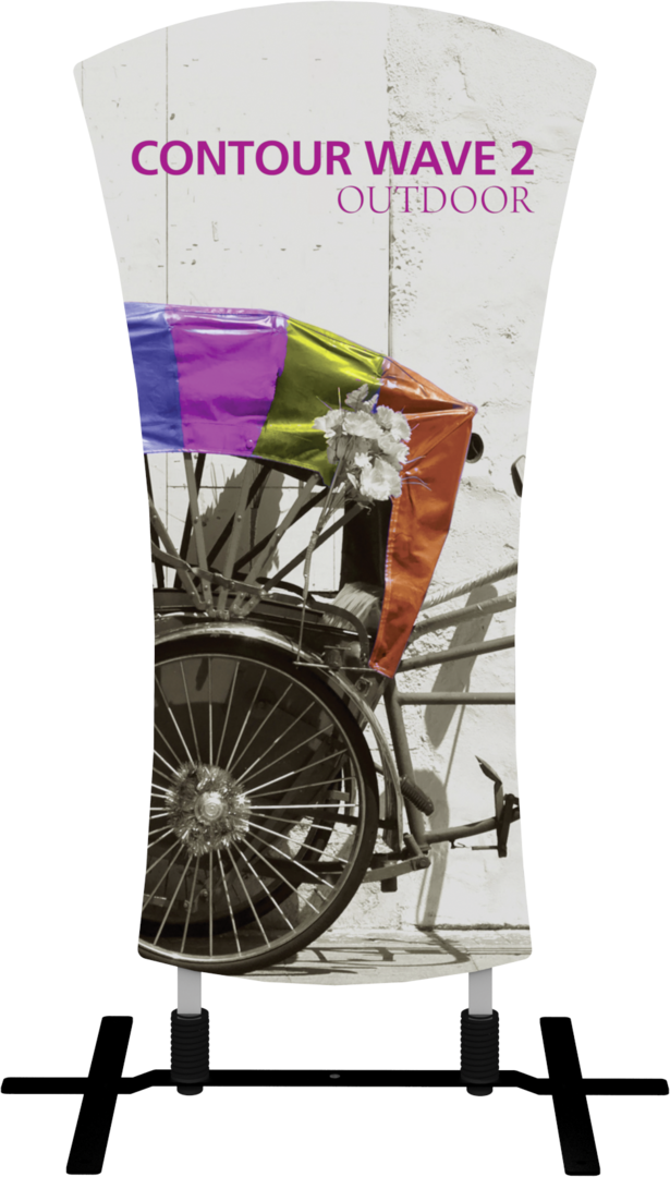 The Contour Wave 2 with a steel plate base is a heavy-duty double-sided sign with an hourglass shape that utilizes hook and loop connections to make graphic changes quick and simple. The discreet plate base comes with four ground stakes for added stability.