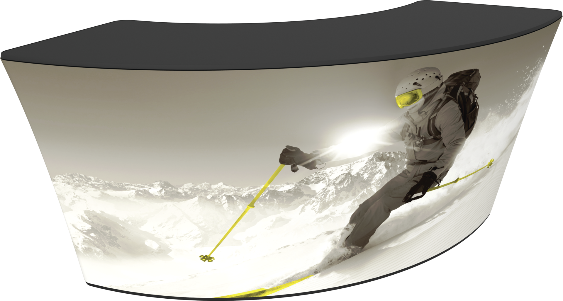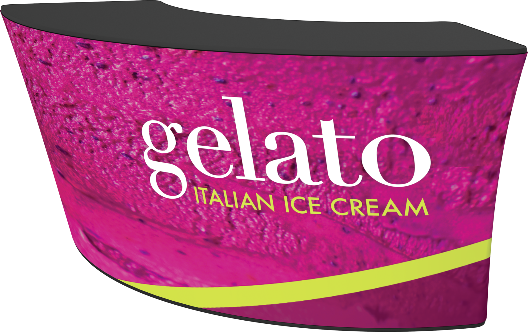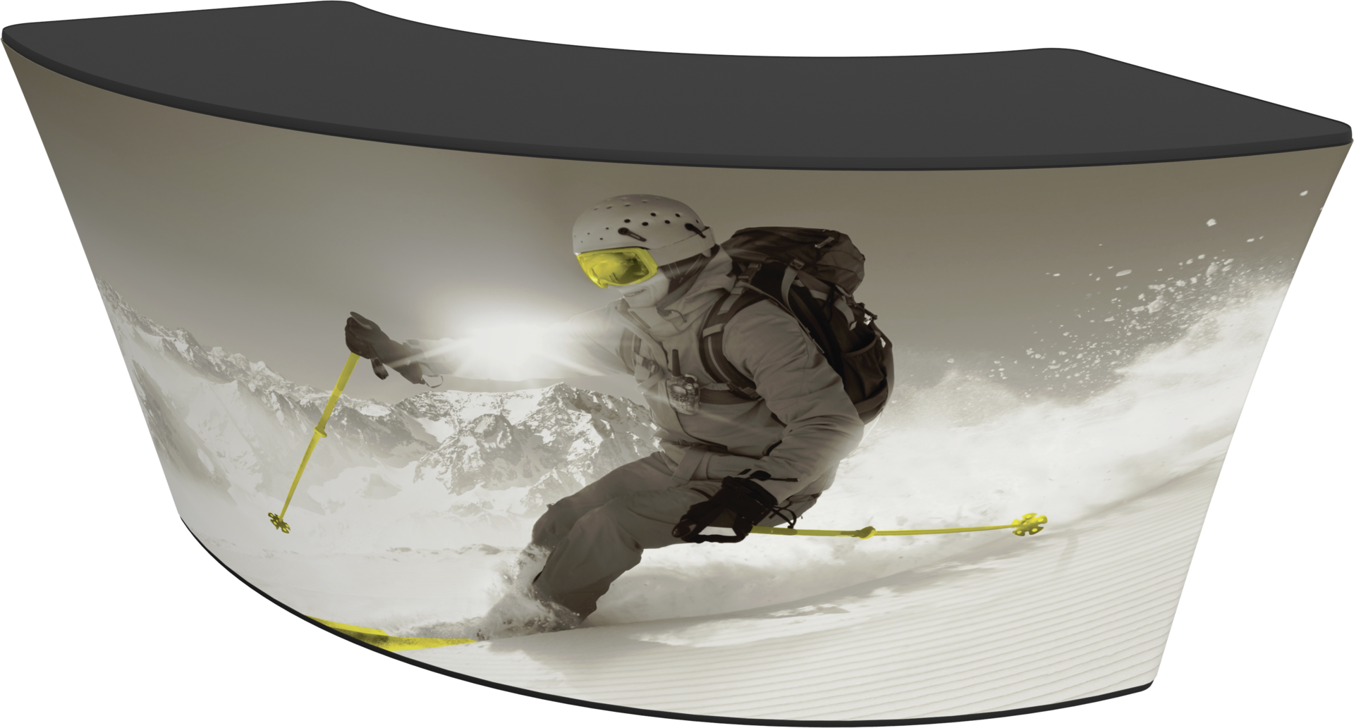 Formulate® Bar counter 02 adds a modern flare to any trade show exhibit, event, or POP display. The curved counter pairs push-fit fabric graphics with a durable countertop and base, and provides the ideal configuration to create a display or reception counter.