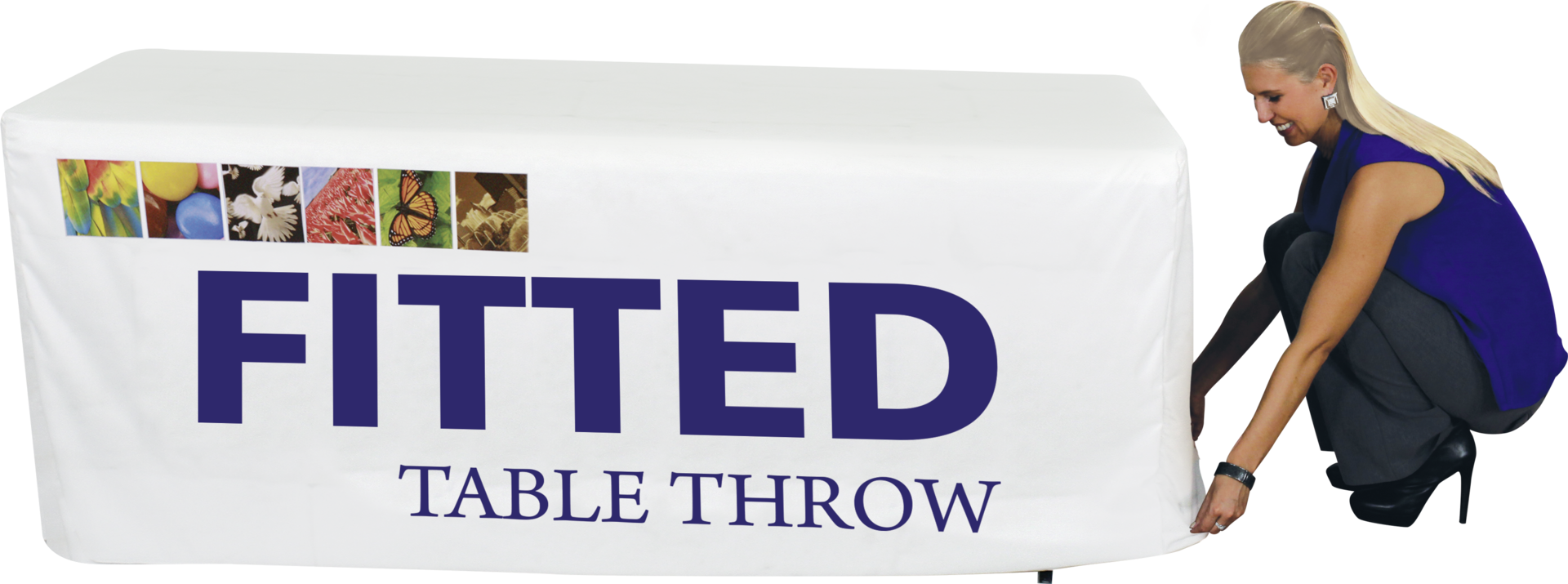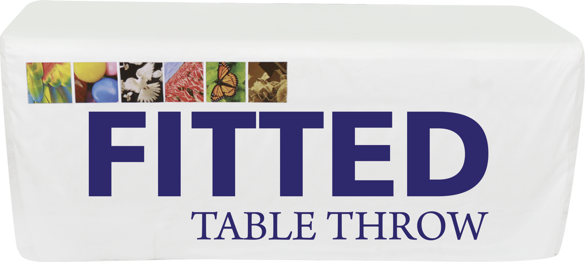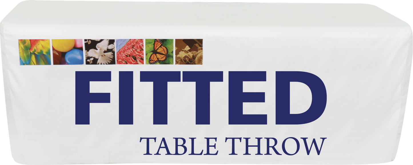 Fitted table throws are form-fitted to standard 8ft, 6ft, 4ft, and 4ft tall (48"W x 36"H demo table) tables to provide a polished, customized, and branded appearance for use at sales events, presentations, trade shows and in retail environments. Fully printed in the USA on washable polyester using dye-sublimation to produce vibrant, full-color graphics, the Fitted Dye Sub table throw will complete your presentation in any setting.