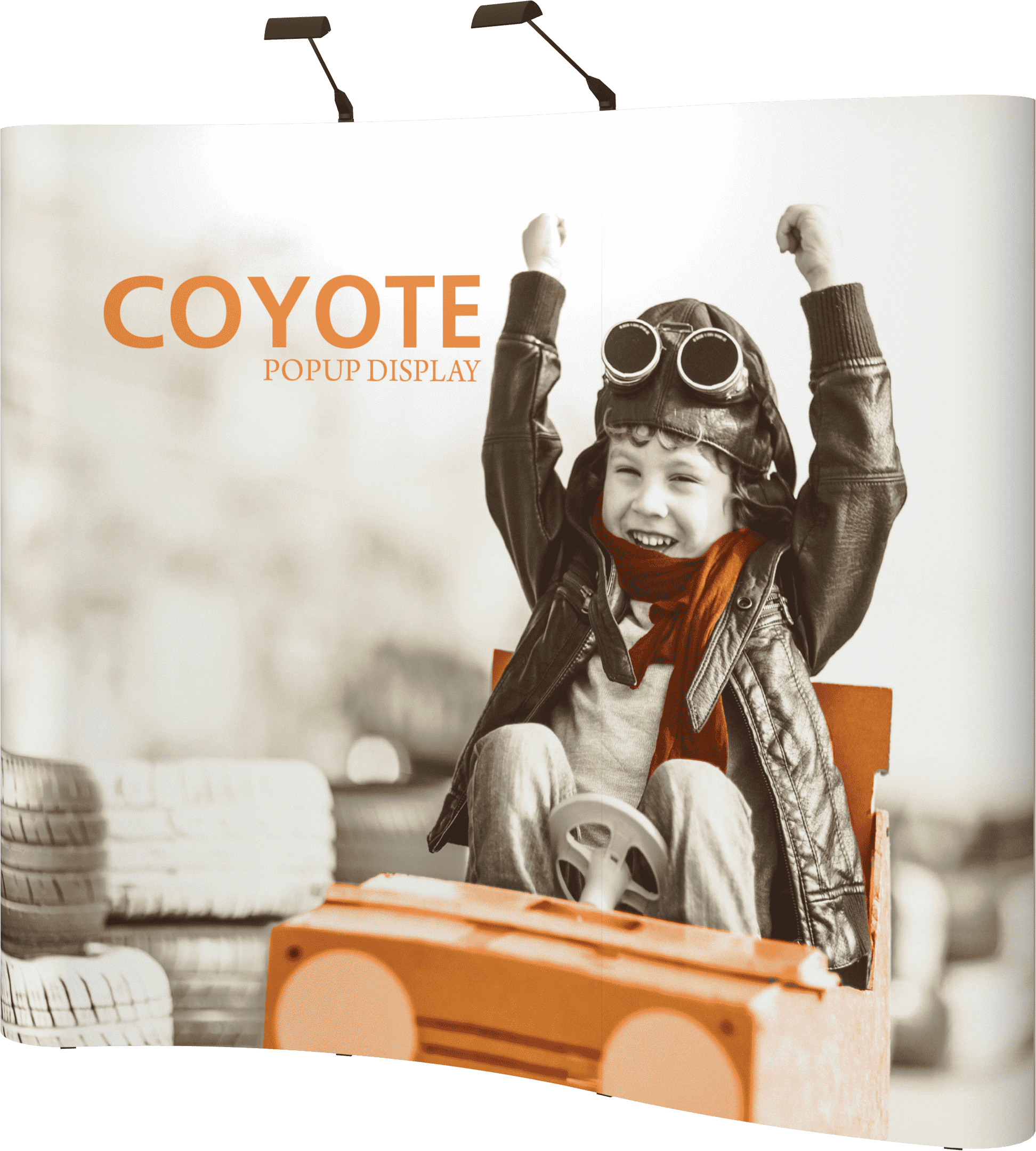 Coyote displays are offered in a variety of sizes and configurations, ranging from 4ft tabletop units to 10ft full height displays available in curved or straight systems, and larger serpentine curved, horseshoe, and gullwing shaped systems. Frames are finished with your choice of either captivating graphic mural panels or versatile hook and loop-friendly fabric panels.