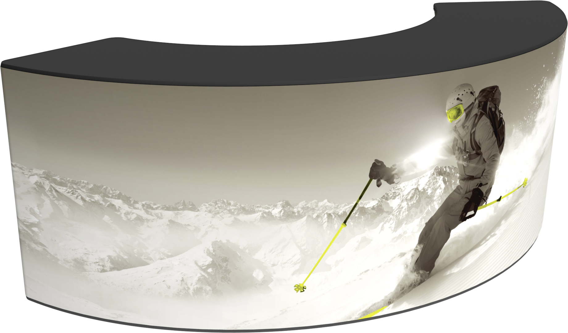 Formulate® Bar counter 03 adds modern flare to any trade show exhibit, event, or POP display. The curved counter pairs push-fit fabric graphics with a durable countertop and base, and provides the ideal configuration to create a display or reception counter.